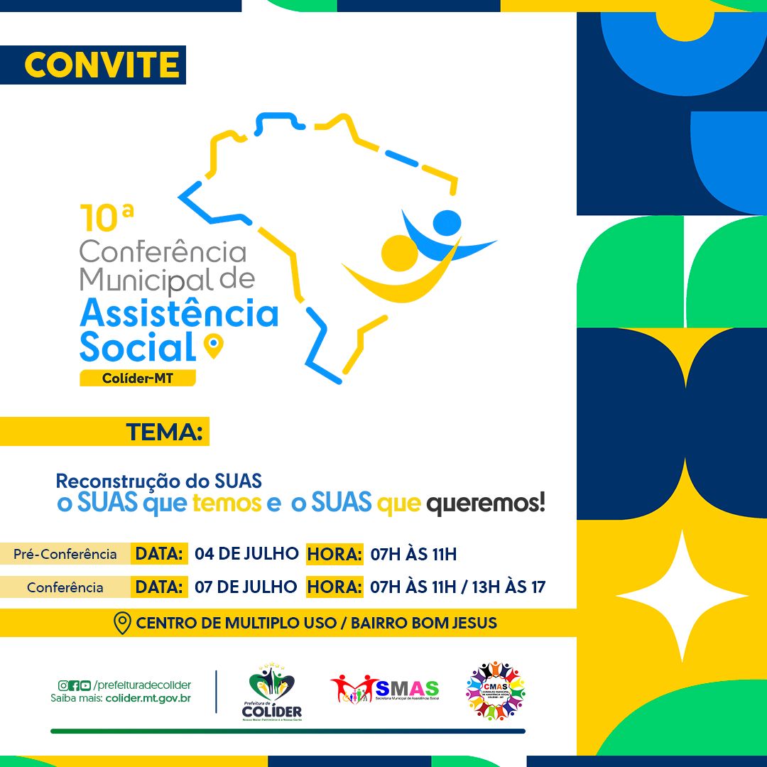 Nesta sexta-feira (07) será realizada em Colíder, a 10ª Conferência Municipal de Assistência Social na modalidade presencial, das 07h:00 às11h:00 e das 13h:00 às 17h:00h
